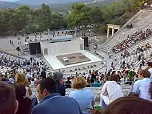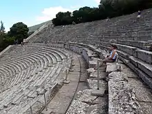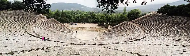 Le théâtre d'Épidaure est le mieux conservé et passe pour le plus accompli de tous les théâtres grecs antiques. Probablement construit au début du IIIe siècle av. J.-C.[1], il est parvenu jusqu'à nous dans un état exceptionnel. Les gradins de calcaire gris, presque tous d'origine, n'ont été restaurés que sur les deux ailes. L'attribution traditionnelle de la construction du théâtre à Polyclète le Jeune, architecte de la tholos qui vivait au IVe siècle av. J.-C., due à Pausanias[3],[4], ne semble plus guère admise[1].