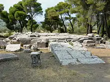Le temple d'Asclépios, construit au début du IVe siècle[2], peut-être par l'architecte Théodotos, était un temple dorique hexastyle (6 x 11 colonnes) de 24,30 × 13,20 m, décoré de frontons (Amazonomachie, Centauromachie, prise de Troie) et d'acrotères par le sculpteur Timothéos d'Épidaure. La statue de culte chryséléphantine était l'œuvre du sculpteur Thrasymédès de Paros.