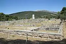 Le sanctuaire s'étend au sud par des établissements destinés à la restauration et à l'hébergement des pèlerins. Un vaste établissement de 76 × 70 m, d'abord interprété comme un gymnase aux nombreuses salles[1], est plutôt identifié aujourd'hui comme un grand ensemble de salles de restauration (hestiatorion), précédées d'une entrée monumentale dorique hexastyle (propylon, partiellement anastylosé en 2008) et disposées autour d'une grande cour intérieure à péristyle[1].