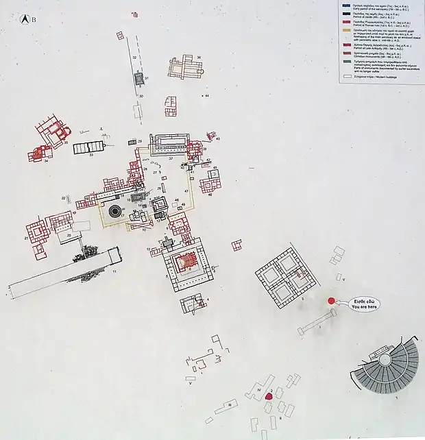 1. Théâtre ; 2. Cimetière ; 3. Katagogéion (accueil et logement des pèlerins) ; 4. Bains ; 5. Gymnase ou salles de restauration (Hestiatorion) ; 6. Odéon romain ; 7. Propylée du gymnase ; 11. Stade ; 14. Autel d'Apollon ; 15. Habitation des prêtres ; 16. Temple d'Asclépios ; 17. Tholos ; 18. Abaton ou enkoimétèrion (portique d'incubation) ; 29. Temple de Thémis ou d'Aphrodite ; 31. Propylée monumental ; 33. Citerne : 37. Portique de Kotys ; 36. Basilique chrétienne ; 38. Thermes romains ; 45. Anakéion (sanctuaire des Dioscures) ; 46. Villa romaine.