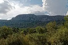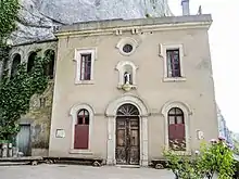 Vue du sanctuaire, au pied des falaises, entourant la grotte de la Sainte-Baume | |