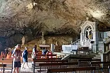Aménagée comme une chapelle, la grotte possède un autel, un tabernacle et des statues de Marie-Madeleine, lieu de dévotion des pèlerins, ainsi qu'une statue de la Vierge Marie et de saint Michel[35]. La partie basse de la grotte est aménagée pour l'accueil et la mémoire des enfants mort-nés[36].