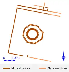Le temple lui-même, associant une cella circulaire sur sa face interne et octogonale sur sa face externe à une galerie périphérique octogonale, affecte une forme assez peu courante pour ce type d'édifice mais que l'on retrouve par exemple à Champallement[13] ou dans un sanctuaire périurbain de Durocortorum (Reims)[14]. Bien qu'aucun seuil n'ait pu être observé, la configuration de la galerie périphérique évoque une ouverture vers le sud-est[15].