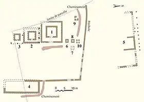 Au nord de ce temple, quatre petits édicules (peut-être cinq) de deux mètres de côté (n° 5, 8, 10 et 11) sont vraisemblablement des autels ou des dépôts d'offrandes. Ce secteur s'est d'ailleurs révélé très riche en mobilier.