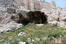 Le versant nord-ouest du rocher de l'Acropole est dominé par trois ouvertures de grottes dédiées respectivement au culte de Pan, Zeus et Apollon. La grotte la plus à l'ouest de la terrasse n'est pas un sanctuaire, mais une cavité sculptée, appelée grotte A dans la littérature archéologique, dont la surface sculptée en forme de podium servait de zone d'observation pour la procession panathénaïque.
