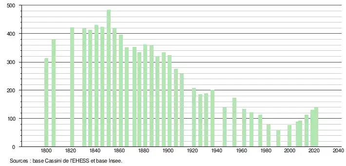 L'évolution du nombre d'habitants est connue à travers les recensements de la population effectués dans la commune depuis 1800. Pour les communes de moins de 10 000 habitants, une enquête de recensement portant sur toute la population est réalisée tous les cinq ans, les populations légales des années intermédiaires étant quant à elles estimées par interpolation ou extrapolation[21]. Pour la commune, le premier recensement exhaustif entrant dans le cadre du nouveau dispositif a été réalisé en 2008[22].
