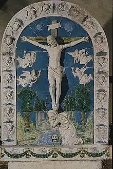 Ainsi la Crucifixion avec Marie-Madeleine, conservé à l'église San Pietro de Radicofani, et attribuée à Santi Buglioni, est plutôt du style de l'atelier des Della Robbia (personnages en blanc, fond bleu et attributs allégoriques des plantes en vert), que celui, affirmé ensuite par Santi Buglioni sur toutes ses productions, qui peint les couleurs d'une façon réaliste et figurative (carnation, vêtements, paysages).