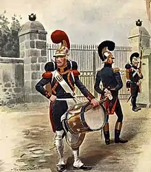 L'habit est en drap bleu de roi à revers noirs, ces derniers étant garnis de boutons jaunes. Les collet, parements sont de la même couleur que les revers ; les retroussis écarlates sont ornés d'une grenade dorée. Les épaulettes sont à franges et tournantes écarlates. Le reste de la tenue ― veste et culotte ― est bleu de roi, comme l'habit. Selon la saison, les guêtres sont en toile noire ou blanche[6].