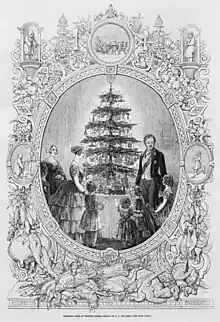 Au début des années 1840, le prince Albert de Saxe, époux de la reine Victoria, introduit une série des rituels de Noël liés au sapin au château de Windsor[23] et une illustration du couple réuni avec leurs enfants autour d'un sapin richement décoré fait le tour du monde[24].