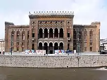 Sur le plan architectural, de nombreux bâtiments publics changent le visage de la ville, comme le bâtiment du gouvernement de Bosnie, construit en 1884 et 1885 sur des plans de l'architecte Josip Vancaš, l'hôtel de ville, construit par Alexander Wittek à partir de 1892, le théâtre national, conçu par Karel Pařík en 1897-1899, la poste centrale, construite par l'architecte Josip Vancaš entre 1907 et 1909, ou les bâtiments actuels du musée national, conçus par Karel Pařík et inaugurés en 1912[10]. Parmi les édifices religieux s'élève la cathédrale du Cœur-de-Jésus, siège de l'archidiocèse de Vrhbosna, construite entre 1884 et 1889 par l'architecte Josip Vancaš[20]. En 1910, Sarajevo compte un peu moins de 52 000 habitants[réf. nécessaire].