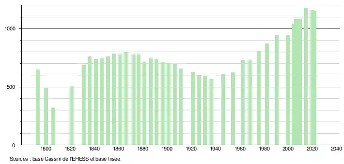 L'évolution du nombre d'habitants est connue à travers les recensements de la population effectués dans la commune depuis 1793. Pour les communes de moins de 10 000 habitants, une enquête de recensement portant sur toute la population est réalisée tous les cinq ans, les populations légales des années intermédiaires étant quant à elles estimées par interpolation ou extrapolation[26]. Pour la commune, le premier recensement exhaustif entrant dans le cadre du nouveau dispositif a été réalisé en 2004[27].