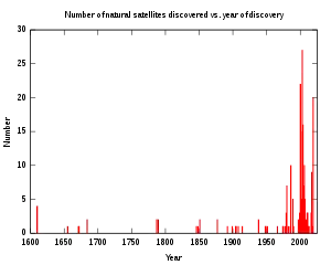 En dehors de la Lune[alpha 1] probablement connue dès la Préhistoire, la première découverte d'un satellite revient à Galilée qui, en 1610, a observé quatre satellites orbitant autour de Jupiter ; on les appelle aujourd'hui les satellites galiléens. Au cours des trois siècles suivants, peu de satellites sont découverts. Des missions spatiales vers d'autres planètes dans les années 1970, notamment avec Voyager 1 et 2, ont amorcé l'augmentation du nombre de détections. Les observations depuis l'an 2000, principalement au moyen de grands télescopes optiques terrestres, ont permis la mise en évidence de nombreux autres satellites, dont tous sont de forme irrégulière.