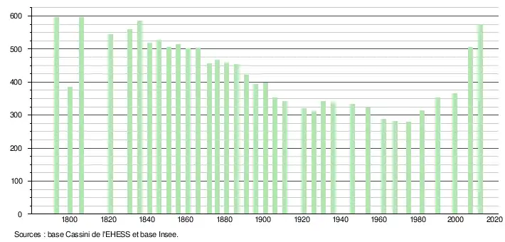 L'évolution du nombre d'habitants est connue à travers les recensements de la population effectués dans la commune depuis 1793. À partir du , les populations légales des communes sont publiées annuellement dans le cadre d'un recensement qui repose désormais sur une collecte d'information annuelle, concernant successivement tous les territoires communaux au cours d'une période de cinq ans. Pour les communes de moins de 10 000 habitants, une enquête de recensement portant sur toute la population est réalisée tous les cinq ans, les populations légales des années intermédiaires étant quant à elles estimées par interpolation ou extrapolation[12]. Pour la commune, le premier recensement exhaustif entrant dans le cadre du nouveau dispositif a été réalisé en 2007[13],[Note 1].