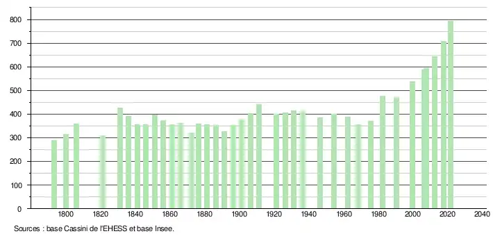 L'évolution du nombre d'habitants est connue à travers les recensements de la population effectués dans la commune depuis 1793. Pour les communes de moins de 10 000 habitants, une enquête de recensement portant sur toute la population est réalisée tous les cinq ans, les populations légales des années intermédiaires étant quant à elles estimées par interpolation ou extrapolation[25]. Pour la commune, le premier recensement exhaustif entrant dans le cadre du nouveau dispositif a été réalisé en 2007[26].