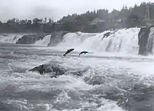 Tous les saumons sont doués d'importantes capacités de saut, pouvant dépasser les 2 à 3 mètres[23] chez le saumon atlantique voire nettement plus chez certaines espèces de la zone pacifique. Cette capacité est cependant pondérée par l'âge du saumon, sa santé (des parasitoses ou maladies virales, ou intoxications, etc. peuvent l'affaiblir) ainsi que par le type d'obstacle (hauteur de chute, pente…) et la configuration du cours d'eau et remous qui précède l'obstacle. Fréquemment le saut lui-même est précédé de tentatives d'esquives de l'obstacle ou par de puissants sauts verticaux « en chandelle »[24] donnant l'impression que l'animal observe l'obstacle avant de le franchir, mais il reste difficile d’interpréter ce qui se passe dans le cerveau de l'animal à ce moment. Chez certaines espèces de poissons, de brutaux sauts verticaux hors de l'eau semblent aussi être des réactions au stress. Selon Thioulouze (1979), le comportement du saumon semble être modifié par « la concentration de pêcheurs lançant des leurres lourds, ou le combat d'un saumon piqué à l'hameçon, ou surtout l'odeur du sang d'un sujet blessé »[25].