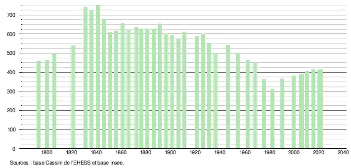 L'évolution du nombre d'habitants est connue à travers les recensements de la population effectués dans la commune depuis 1793. Pour les communes de moins de 10 000 habitants, une enquête de recensement portant sur toute la population est réalisée tous les cinq ans, les populations légales des années intermédiaires étant quant à elles estimées par interpolation ou extrapolation[22]. Pour la commune, le premier recensement exhaustif entrant dans le cadre du nouveau dispositif a été réalisé en 2005[23].