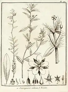 En 1775, le botaniste Aublet propose le protologue suivant pour Sauvagesia adima (synonyme de Sauvagesia erecta L., 1753 var. erecta)[21] :
