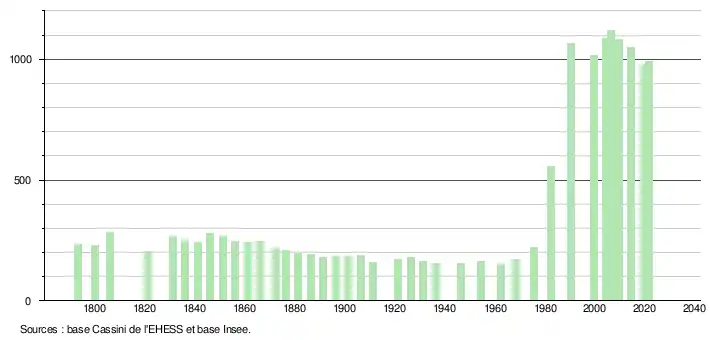 L'évolution du nombre d'habitants est connue à travers les recensements de la population effectués dans la commune depuis 1793. Pour les communes de moins de 10 000 habitants, une enquête de recensement portant sur toute la population est réalisée tous les cinq ans, les populations légales des années intermédiaires étant quant à elles estimées par interpolation ou extrapolation[19]. Pour la commune, le premier recensement exhaustif entrant dans le cadre du nouveau dispositif a été réalisé en 2004[20].