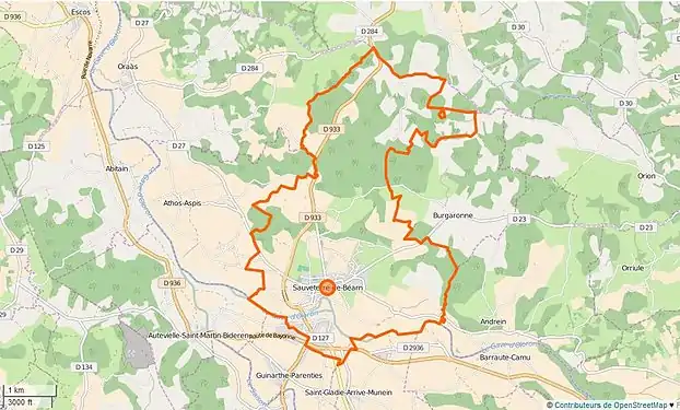 Les communes les plus proches[Note 2] sont[6] : Guinarthe-Parenties (2,0 km), Saint-Gladie-Arrive-Munein (2,2 km), Osserain-Rivareyte (2,7 km), Autevielle-Saint-Martin-Bideren (2,8 km), Burgaronne (2,8 km), Athos-Aspis (3,2 km), Andrein (3,3 km), Barraute-Camu (3,8 km).