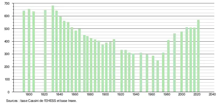 L'évolution du nombre d'habitants est connue à travers les recensements de la population effectués dans la commune depuis 1793. Pour les communes de moins de 10 000 habitants, une enquête de recensement portant sur toute la population est réalisée tous les cinq ans, les populations légales des années intermédiaires étant quant à elles estimées par interpolation ou extrapolation[23]. Pour la commune, le premier recensement exhaustif entrant dans le cadre du nouveau dispositif a été réalisé en 2006[24].