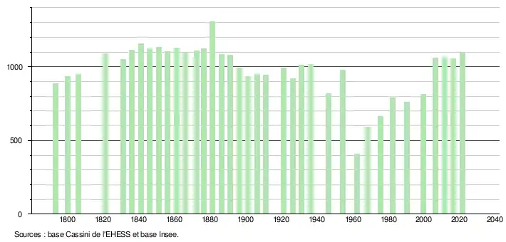 L'évolution du nombre d'habitants est connue à travers les recensements de la population effectués dans la commune depuis 1793. Pour les communes de moins de 10 000 habitants, une enquête de recensement portant sur toute la population est réalisée tous les cinq ans, les populations légales des années intermédiaires étant quant à elles estimées par interpolation ou extrapolation[35]. Pour la commune, le premier recensement exhaustif entrant dans le cadre du nouveau dispositif a été réalisé en 2006[36].