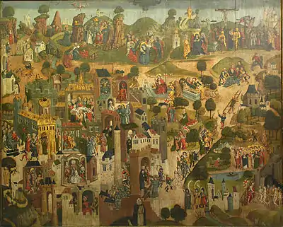 | 1. | Jésus entre dans la ville à dos d'âne le Dimanche des Rameaux | En haut à gauche, à l'extérieur des murs de la ville |