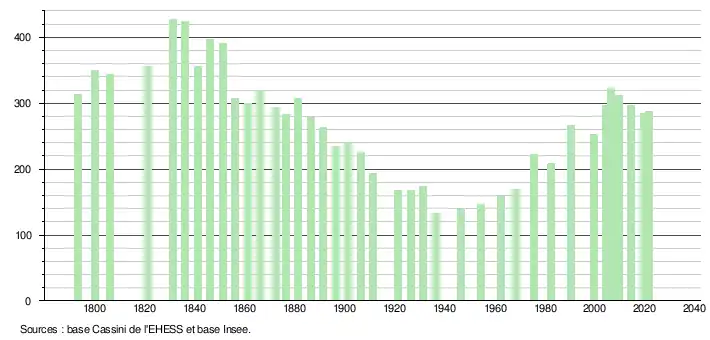 L'évolution du nombre d'habitants est connue à travers les recensements de la population effectués dans la commune depuis 1793. Pour les communes de moins de 10 000 habitants, une enquête de recensement portant sur toute la population est réalisée tous les cinq ans, les populations légales des années intermédiaires étant quant à elles estimées par interpolation ou extrapolation[25]. Pour la commune, le premier recensement exhaustif entrant dans le cadre du nouveau dispositif a été réalisé en 2004[26].