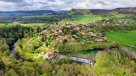 Le village de Scey-en-Varais s'est développé dans une boucle de la Loue au milieu d'un élargissement de la vallée.