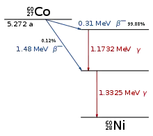 Ces relations peuvent être assez compliquées; ici, un cas simple est montré : le schéma de désintégration d'un isotope radioactif de cobalt, le 60Co. Cet isotope se désintègre en émettant un électron (radioactivité β) avec une demi-vie de 5,27 années dans un état excité de 60Ni, et celui-ci retombe très vite à son état fondamental, en émettant deux photons gamma. Dans un cas sur 1000, l'électron est éjecté avec une énergie qui intègre celle du premier rayon gamma, et seul le second est ensuite émis.