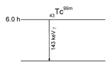 En général, les états excités des noyaux ont une vie moyenne très brève, et se désexcitent presque instantanément après une désintégration bêta par transition gamma (voir ci-dessus). En revanche, l'état excité de l'isotope de technétium montré ici à droite a une demi-vie assez longue. C'est pourquoi on l'appelle "métastable" (indiqué par le "m" de 99mTc). Il retombe à l'état fondamental par transition (ou désexcitation) gamma avec une demi-vie de 6 heures.