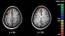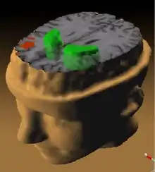 - Les gènes NOTCH4, NRG1 ou DTNBP1[28] : le gène DTNBP1 est un des gènes les plus susceptibles d'expliquer des cas de schizophrénies avec des résultats concordants plusieurs fois répliqués[68],[69],[70],[71],[72]. Les changements d'allèles de deux marqueurs de polymorphisme nucléotidique simple Rs1018381 et Rs2619522 sur le gène DTNBP1 impactent tous deux le volume de matière grise dans des régions du cerveau bien spécifiques[73]. On a pu révéler par IRM[74] que les porteurs de l'allèle G sur rs2619522 exhibaient un volume plus élevé de matière grise dans l'hippocampe, le cortex frontal et pariétal. Les porteurs de l'allèle T de rs1018381 possédaient une augmentation de volume dans les régions du lobule lingual et du thalamus. Les auteurs ont noté l'effet contre-intuitif de l'augmentation du volume de l'hippocampe, contraire à la réduction habituellement observée pour d'autres cas de schizophrénies. Environ 25 % des Européens possèdent l'allèle G du marqueur rs2619522 et environ 5 % sont homozygotes GG[75]. Quant à Rs1018381, environ 15 % des Européens possèdent l'allèle T et moins d'1 % sont homozygotes TT[76], ce qui prouve une faible sélection naturelle de ces génotypes dans cette population. Les individus portant un seul allèle à risque à la fois sur Rs1018381 et Rs2619522 posséderaient un endophénotype cérébral compromis particulièrement vulnérable pour développer un plus grand risque de schizophrénie.