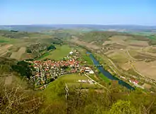 Au fond, au-delà de Oberhausen, le vignoble Kupfergrube de Schlossböckelheim (vu depuis l'autre rive de la Nahe).