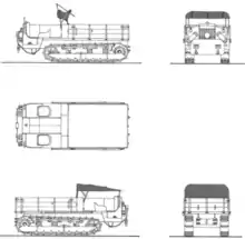Sur le châssis sont montés successivement le poste de conduite, le réservoir d'essence et une caisse de transport[2].