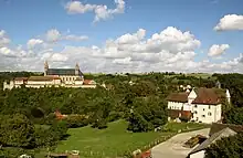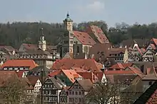 - Pour l'abbaye de Combourg, le lit originel du Kocher formait à cet endroit un méandre qui, après la coupure naturelle par débordement, a créé une bute témoin sur laquelle a d'abord été construit le château-fort des comtes de Comburg[12] avant qu'ils n'en fassent un monastère.