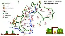 La ceinture forestière composée d’abattis, de fossés et de passages obligés[27] était parfois gardée par des fortins[31] en bois ou pierre aux endroits stratégiques et représentatifs. Elle intègre les rivières et ruisseaux comme frontière naturelle[27]. En taillant et entretenant les arbres de telle sorte qu’ils poussent plutôt en largeur et bien resserrés, les ronces et les buissons épineux pouvaient pousser dans les petits intervalles restants et engendrer des haies semblables à des murs[32] difficilement franchissables sans provoquer de dégâts aux chevaux ou aux hommes qui restent coincés dans l’enchevêtrement de branchages et d’épines[27]. Au cas où une personne arrive à passer le premier abattis, il en existe un second douze mètres après le premier, ce qui permet aux défenseurs d’agir pendant que l’intrus tente de se démêler de la première, puis de la deuxième haie. La haie est double entre les deux bornes des États concernés : deux talus de 200 cm se font face à une distance de 12 m. Entre la borne et le talus, il y a un fossé de 200 cm et un ruban de buissons épineux d’une largeur de 100 cm. La largeur totale de la haie forestière de Hall entre les deux bornes territoriales s’élève à 22 m. Il y avait trois possibilités pour traverser la haie forestière :