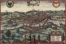 - 1610 : Schwäbisch Hall devient membre de l'Union évangélique, ce qui engage des frais conséquents et place les Hallois dans le camp adverse des puissants voisins de la Bavière et de la principauté épiscopale de Wurtzbourg[19], membres dirigeants de la Ligue catholique. Le , le roi de France Henri IV s'engage par le traité de Schwäbisch Hall à soutenir les princes de l'Union Évangélique[20].