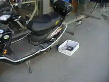 Un scooter (du verbe anglais to scoot signifiant « démarrer brusquement, filer »[1]) ou scouteur (Canada[2]) est un véhicule routier motorisé à deux ou trois roues, caractérisé par des roues de faible diamètre, un cadre ouvert formant plancher (un large espace entre les roues permet d’y placer les pieds et éventuellement des bagages) et un carénage.