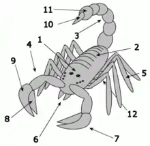 Le corps d'un scorpion est divisé en trois parties : le céphalothorax (ou prosome), le mésosome et le métasome (certains regroupent ces deux derniers en abdomen ou opisthosome)[6].