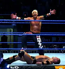 - W.O.R.M. (L'adversaire est au sol, allongé sur le dos, l'attaquant est debout, il fait un demi-tour et saute trois ou quatre fois à pieds joints. Pendant que les fans crient les lettres « W » « O » « R » « M », ce dernier se retourne vers son adversaire et commence à faire le ver de terre pendant trois fois. Une fois ces trois fois terminés, l'attaquant commence à faire une danse et plonge sa main sur la poitrine de son adversaire, provoquant ainsi, un atémi.)[15]