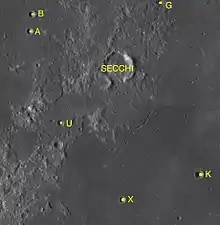 Par convention, les cratères satellites sont identifiés sur les cartes lunaires en plaçant la lettre sur le côté du point central du cratère qui est le plus proche de Secchi.