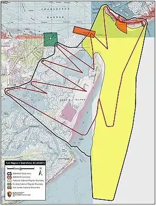 - Assault on Battery Wagner Cartes, historique, photos, et informations sur la préservation du site ("Civil War Trust")