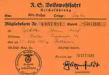 Le Secours populaire national-socialiste (Nationalsozialistische Volkswohlfahrt, NSV) était une organisation d’aide sociale créée en 1931 et organe du parti national-socialiste. Son siège était à Berlin. La structure du NSV était basée sur le modèle du parti national-socialiste, avec des administrations locales, de comté (Kreis) et de district (Gau)[1].