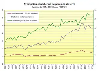 La production canadienne de pommes de terre a sensiblement augmenté au cours des dernières décennies. Selon les statistiques publiées par la FAO, elle est passée de 2,01 millions de tonnes en 1961 à 4,58 Mt en 2009, soit une multiplication par un facteur 2,3. La croissance de la production a été particulièrement forte dans les années 1990 et le début des années 2000 pour atteindre son maximum historique à 5,28 millions de tonnes en 2003. Elle a légèrement décru depuis.