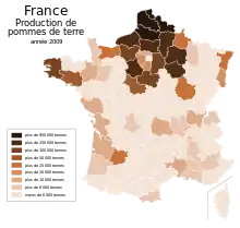 La production française de pommes de terre est fortement concentrée dans la partie nord du pays (Nord et bassin parisien) où se trouve aussi l'essentiel de l'industrie de transformation. Les trois premiers départements producteurs sont en 2009 la Somme (1,5 Mt), le Nord (1,2 Mt) et le Pas-de-Calais (0,95 Mt), soit 51 % du total national. La production de plants est localisée principalement dans les régions littorales, en Bretagne (Finistère) et dans le Pas-de-Calais, tandis que celle des primeurs se répartit sur le littoral, du Pas-de-Calais aux Landes en passant par le Finistère et la Charente-Maritime, dans le Centre, ainsi que dans les régions méridionales (Pyrénées-Orientales). .