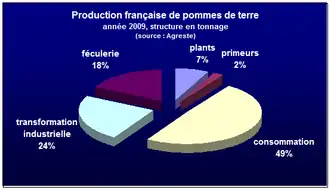 En France, le secteur de la pomme de terre occupait en 2009 une superficie de 164 000 hectares pour une production de 7,2 millions de tonnes, plaçant le pays au dixième rang mondial des pays producteurs de pomme de terre. Le rendement moyen se situait à 43,8 tonnes par hectare. Cette culture occupe une place modeste en superficie, environ 0,9 % de la surface arable[1] (France entière, y compris DOM), contre 51,5 % pour les céréales et 2 % pour la betterave industrielle[2]. C'est une activité qui concerne environ 25 000 agriculteurs.