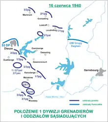 Neuf mois et demi plus tard, le , la guerre de position se termine par la percée de Sedan. Le le secteur de la Sarre reçoit les premiers détachements de la 1re Division de grenadiers polonais, DIP, partie de Coëtquidan fin avril[6]. Le , ils sont quinze mil travailleurs immigrés volontaires, souvent mineurs dans le nord de la France, encadrés par des officiers de l'armée du Gouvernement polonais en exil et positionnés en appui du groupement colonial du colonel Dagnan que composent le 41e RMIC et les réservistes du 51e RMIC[6].