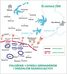 Ce , 1 123 soldats polonais à court de munitions sont capturés à Azoudange[6], au sud-est de Dieuze. 300, faute de véhicules, le sont à Gelucourt, au sud du même chef-lieu de canton, mais le reste du 2e Bataillon du RGP et son commandant Wrona échappent aux camions de la 60e DI qui les avaient dépassés[6]. Les fantassins allemands souffrent cependant du manque d'appui blindé, artillerie et cavalerie étant retardées par les inondations et par les destructions de pont opérées par les sapeurs durant la manœuvre de freinage[6].