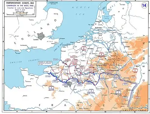 Deux cent cinquante kilomètres à l'ouest, le , soit six jours après la défaite de Dunkerque, la ligne Weygand, front de repli, est percée par l'offensive allemande dite Plan rouge et le gouvernement fuit Paris.