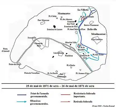 Les communards ne tiennent plus qu'un « quadrilatère » : canal de l'Ourcq, bassin de la Villette, canal Saint-Martin, boulevard Richard-Lenoir, rue du Faubourg-Saint-Antoine et porte de Vincennes.