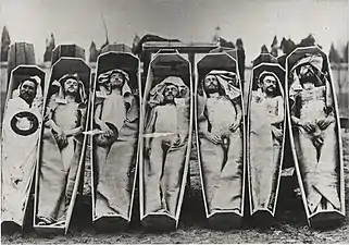 Le bilan humain des victimes communardes fait quant à lui l'objet de débats et de controverses[25]. En 1876, le journaliste socialiste Prosper-Olivier Lissagaray, ancien communard, rapporte que le conseil municipal de la ville de Paris paye l'inhumation de 17 000 cadavres. En prenant en compte les tués hors de Paris, il estime à probablement vingt mille le nombre des fusillés de la semaine sanglante[26], sans compter trois mille fédérés tués ou blessés au combat[27],[25]. En 1880, le journaliste et homme politique Camille Pelletan, membre du Parti radical-socialiste, élève le nombre des victimes à trente mille[28],[25]. Ce nombre est ensuite abondamment repris par les différents auteurs du XIXe et du XXe siècle[25]. En 2021, l'historien Éric Fournier indique cependant que ce bilan a un double niveau de lecture, car Camille Pelletan cherche ainsi à présenter la semaine sanglante comme plus meurtrière encore que la Terreur de 1792-1794 et ainsi réhabiliter les débuts de la Première République[25].
